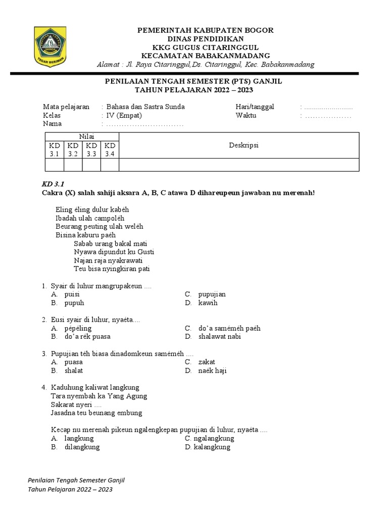 - Reading Comprehension (Pemahaman Bacaan): Bagian ini menguji kemampuan siswa dalam memahami teks tertulis, baik itu narasi, deskripsi, dialog, surat, pengumuman, maupun jenis teks informasional lainnya. Siswa diharapkan mampu mengidentifikasi ide pokok, informasi spesifik, makna kata dalam konteks, tujuan penulis, dan menyimpulkan isi teks.